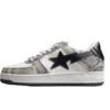 Crafted from premium materials, the upper showcases a sophisticated snakeskin pattern in black and grey tones, offering a unique texture and visual appeal. The white leather base provides a crisp, clean contrast, allowing the intricate snakeskin design to stand out. The black BAPE star logo on the sides adds a bold touch, further enhancing the overall design. Additionally, the heel features the classic BAPE branding, including the distinctive ape head logo.