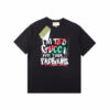 This sleek black Gucci t-shirt features a bold, colorful “GUCCI” logo across the chest in block letters. Below the logo, the names of iconic cities around the world are listed in white, such as Florence, Rome, Paris, and Tokyo, among others. This design pays homage to the global influence and presence of the brand, making it a perfect pick for the world traveler or fashion-savvy individual looking to make a statement.